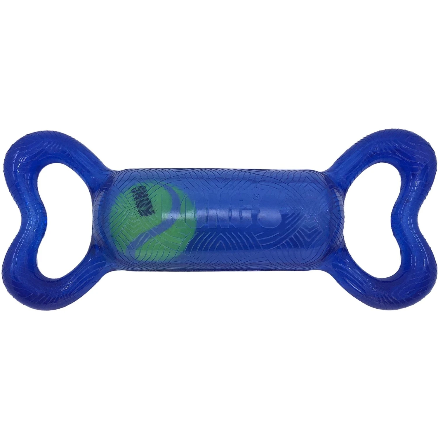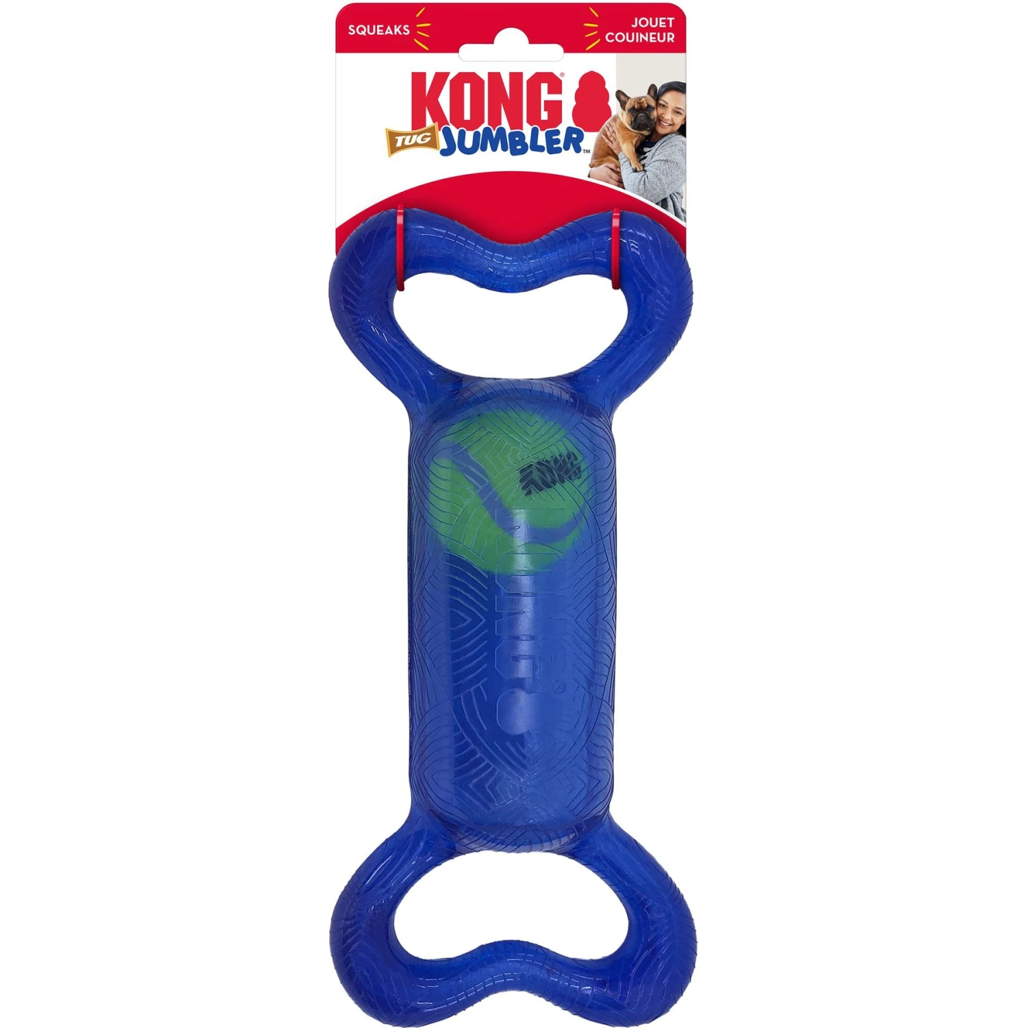 The KONG Jumbler Tug Dog Toy is su-paw durable and can withstand tough play. A rolling interior tennis ball and loud squeak will spark paw-some tug-and-fetch fun. Two handles make tugging and shaking easy, allowing for interactive play.