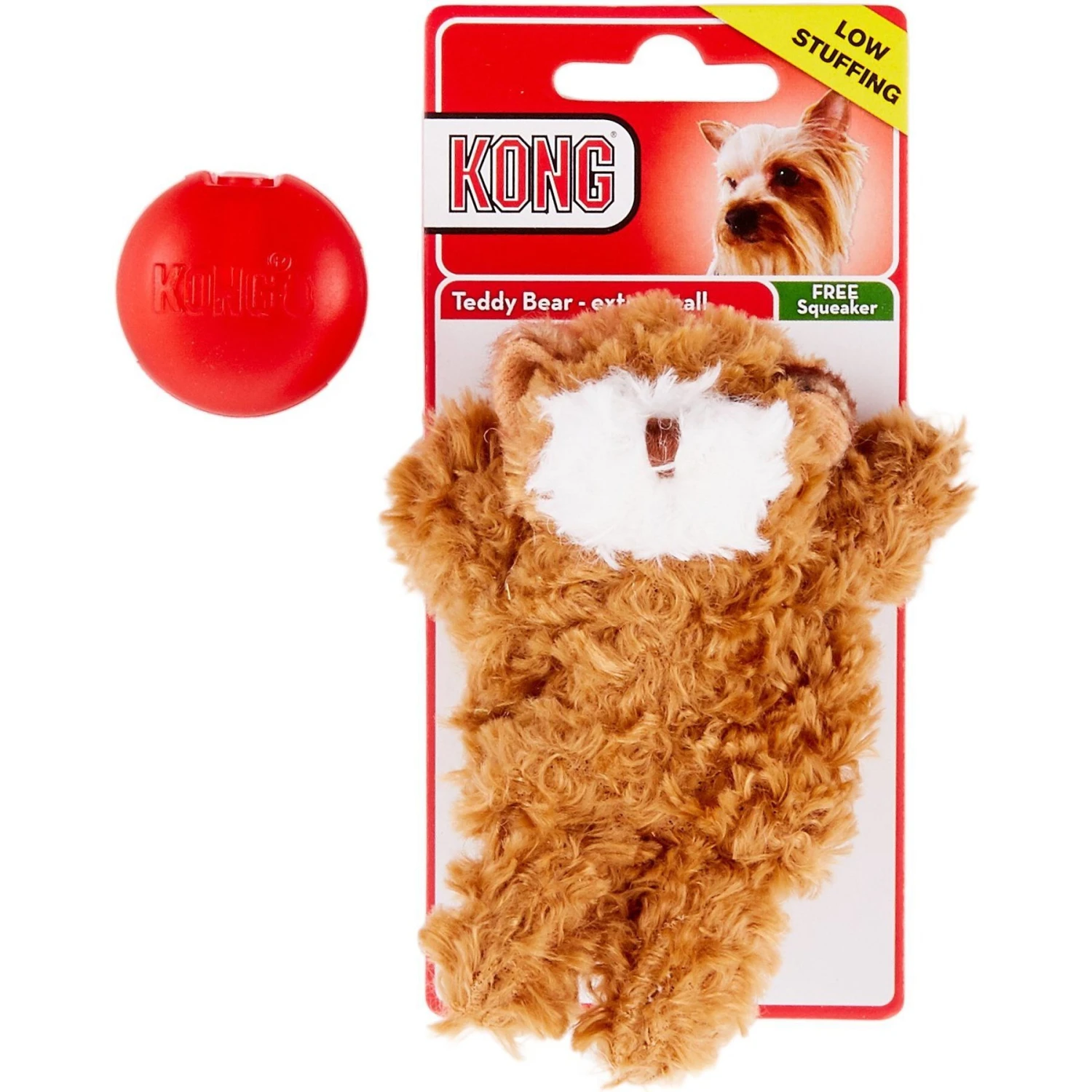 KONG Plush Teddy Bear Dog Toy, X-Small—The KONG Dr. Noyz Teddy Bear guarantees playtime fun in more ways than one. Thanks to its removable squeaker, you can change how you play to match your mood. Looking for a little peace and quiet? No problem! Pull the squeaker and enjoy a lighter round of play, or a snuggly cuddle session. With minimal stuffing, there’s less potential for mess, too—which ensures both cuddle time and playtime are a delight for all involved. It also includes an extra squeaker to make sure those active play sessions last longer. If the squeaker ruptures after a while, simply replace it with a new one. A soft cuddly exterior make this toy great for cuddle time as well.