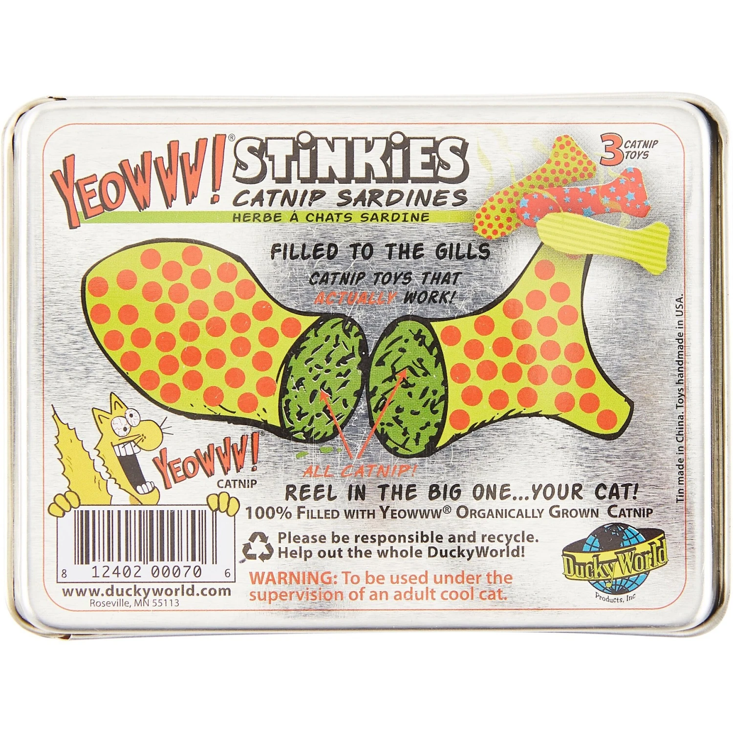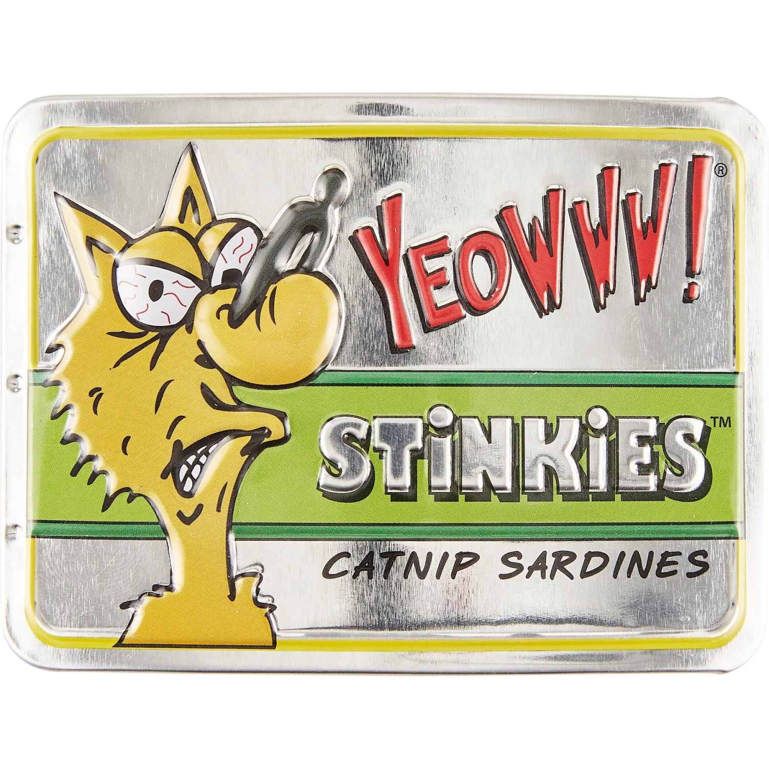 Yeowww! Stinkies Catnip Sardines Cat Toys are wonderfully strong, catnip-filled toy sardines your cat is sure to get hooked on. Every tin contains three brightly colored, fish-shaped toys cats love batting, biting, chasing and chewing. Each fun, 3-inch long toy is filled to the gills with 100% organic catnip, not low-quality catnip found in some toys. Sure to keep your cat entertained for hours.